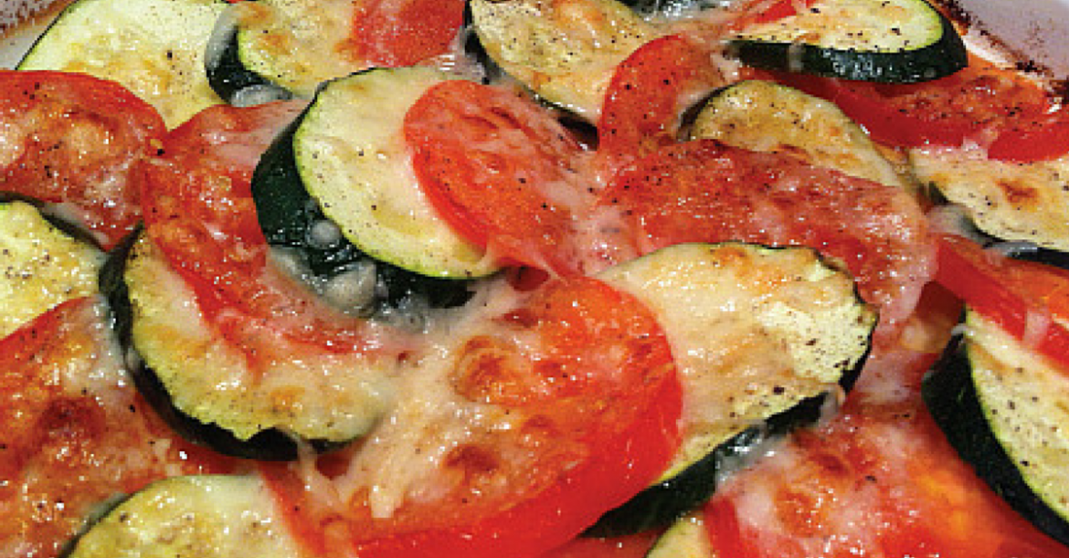 Rub the garlic clove over the base of an 8” shallow baking dish, discard the clove. Pour the olive oil into the dish and swirl it around to coat the bottom. Alternate the zucchini and tomatoes around the dish, gradually filling into the center. Sprinkle with the grated cheese, season with salt and pepper and bake for 20-25 minutes until the cheese is gold brown and crunchy and the vegetables are soft.