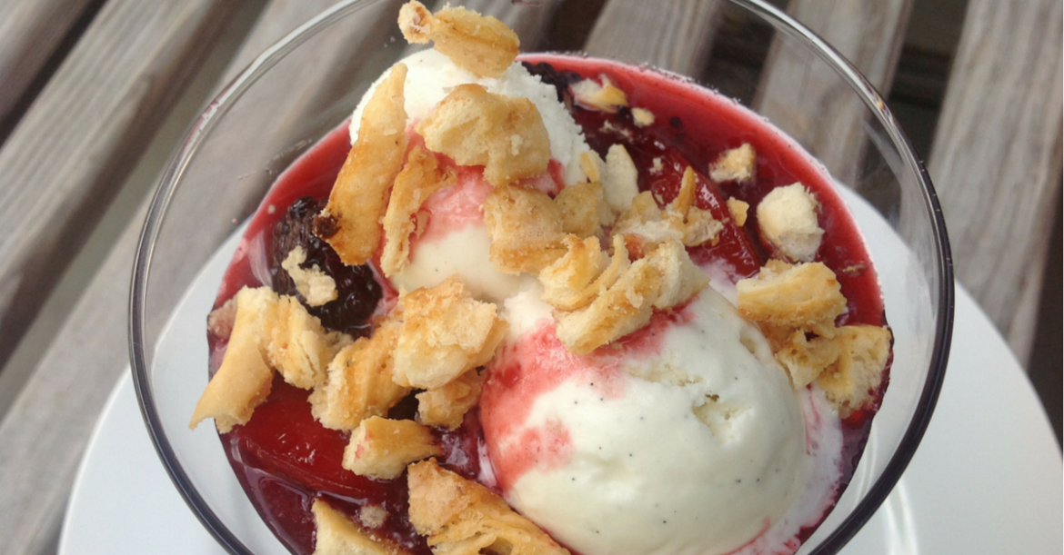 Mix together flour, 2 teaspoons of sugar, baking soda, baking powder and salt in a medium size bowl. Mix in the butter with your fingertips then stir in the buttermilk with a fork until just combined—do not over mix. Drop the topping dough into 4-6 mounds over the filling leaving space in between. Sprinkle topping with remaining sugar and bake until topping is golden brown and fruit is bubbling, about 25-30 minutes. Cool to room temperature and serve warm with vanilla ice cream.