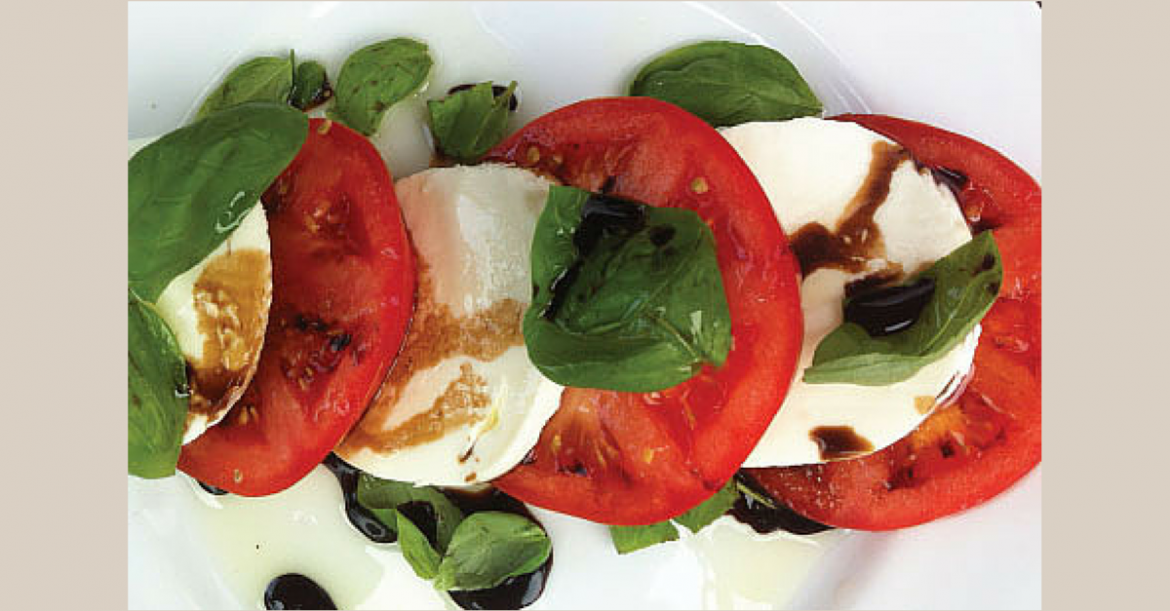 Layer alternating slices of mozzarella and tomatoes, add basil leaves between the slices and on top. Drizzle with the olive oil, and I like to add balsamic vinegar – because I just love it! Season with salt and pepper to taste.