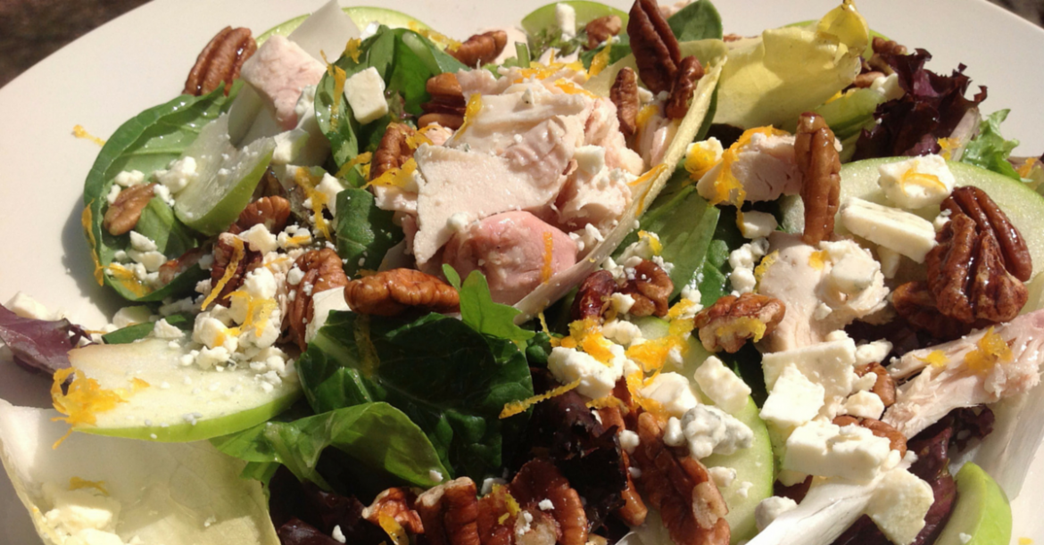 Wash all the salad greens and dry on paper towels or in a spinner. Put onto two large serving plates and add 3-4 endive leaves to each plate. Thinly slice the apple and arrange on top of the greens. Add the chicken, blue cheese and pecans. Sprinkle with the oil and vinegar and fresh orange zest. Enjoy!