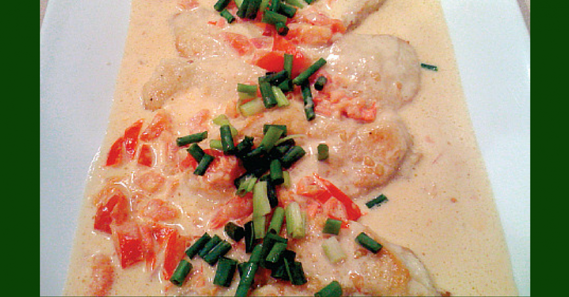Season the flour with salt and pepper and dust the cutlets with the flour. Warm the oil in a pan and sauté the cutlets until cooked through. Transfer the cutlets to a platter and keep warm. Pour any excess oil from pan and then glaze with the vodka, away from the heat, then cook until vodka is nearly gone. Add the chicken broth and lemon juice. Return the cutlets to the pan and cook each side one minute. Transfer cutlets to a warm serving platter. Add the cream and tomatoes to the pan to finish the sauce. Heat through and pour over the cutlets then garnish with the scallions.