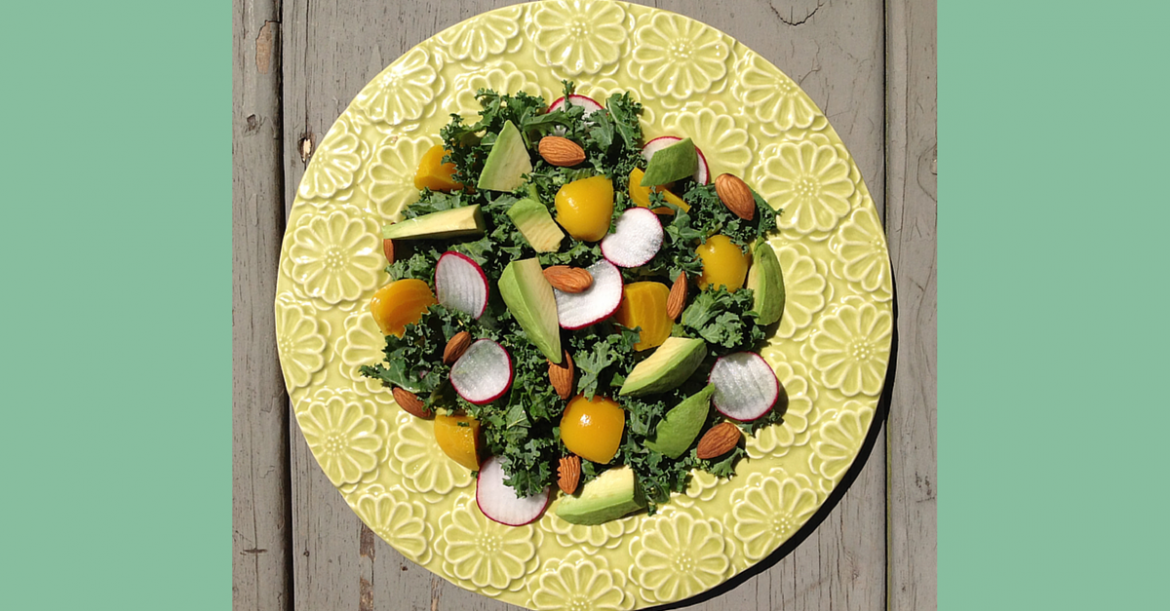 Raw kale in a salad adds a perfect crunch and feels more substantial than salad greens, plus it’s really tasty and good for you! The Golden Beets, just add a nice touch of sweetness and pop of color.