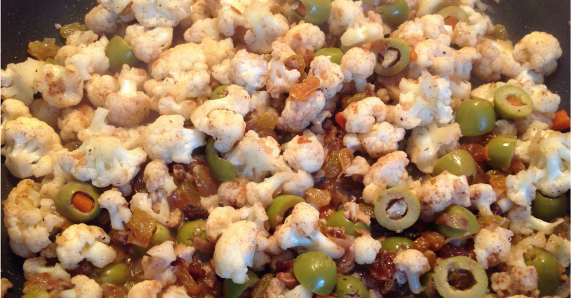 Stir in the olives, raisins, cinnamon, salt and pepper. Stir over the heat until very fragrant, a minute or so. Then pour in the wine or vermouth and bring to a full simmer. Bubble for two minutes to steam the vegetables a bit and to reduce the wine or vermouth until it’s the consistency of a dressing. Scrape the entire contents of the pot into a large bowl. Stir in the cooked Kamut.
