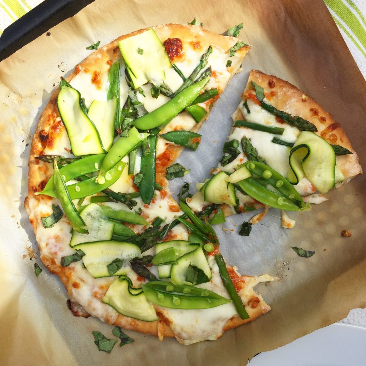 We topped it with the garlic and mozzarella (sorry but it needed more cheese), blanched asparagus, sugar snaps and baked it at 500 degrees for 12 minutes and then followed the recipe above for the zucchini topping. Yummy!!
