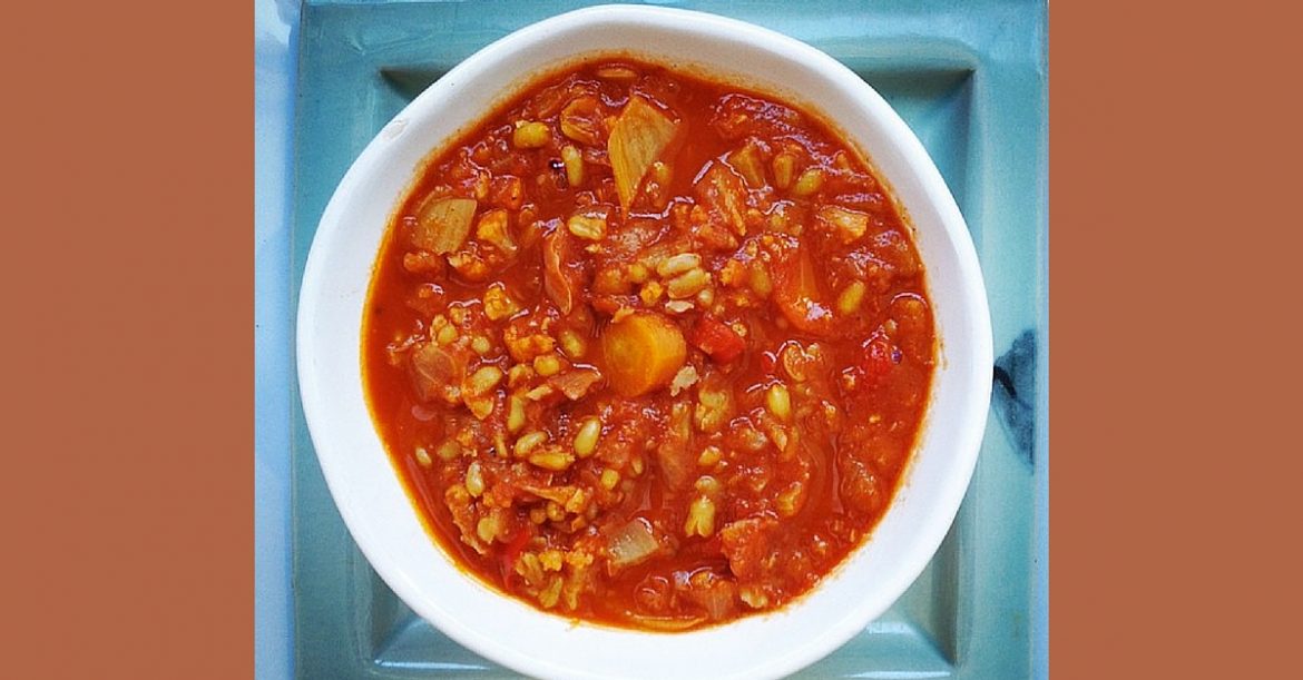 Heat a large greased pot over medium heat. Add onion, celery, and red pepper, and sauté until onions are translucent. Add cumin, cinnamon, ginger, paprika, cayenne pepper, salt, and pepper, and cook for another minute until fragrant. Add carrots and fennel. Cover and cook for 5 minutes. Add the cauliflower, chickpeas, cooked Kamut berries, tomatoes, vegetable broth, and garlic, making sure that everything is covered in liquid.