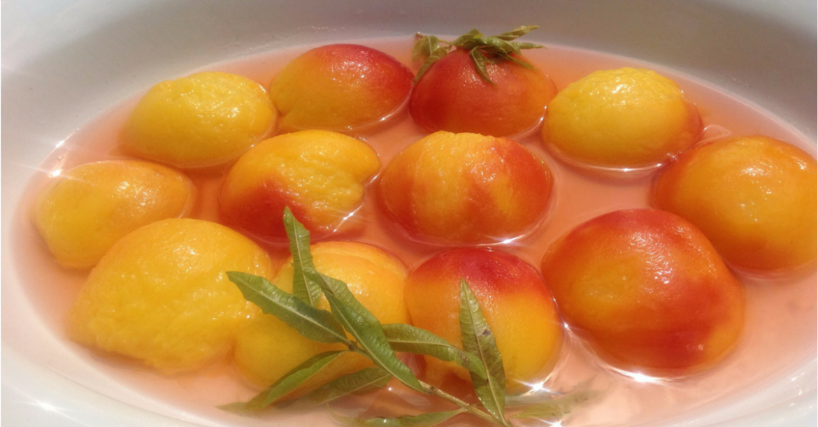 In a large saucepan combine the water, sugar and honey and bring to a simmer. Add the lemon verbena and peach halves to the pan. Bring to the boil, then reduce heat to a simmer for 7-8 minutes until the peaches are tender. Remove peach halves and place on a baking sheet to cool for a few minutes and carefully remove the skins. Remove the lemon verbena sprigs and boil the liquid over a moderate heat until it’s reduced by half. Let the syrup cool to room temperature. Place peach half in a large oval dish, pour over the syrup and add some fresh lemon verbena sprigs.