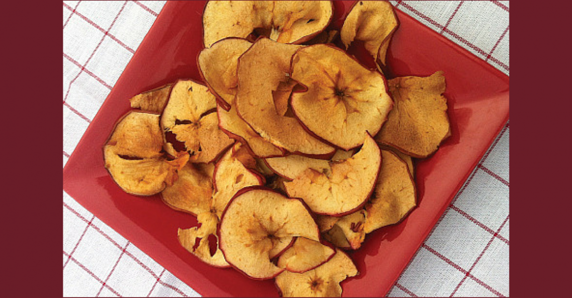 One large apple sliced crosswise ¼” thick, with the seeds removed will fill two baking sheets. You can use any sweet, crisp apples. One apple will make about 20 chips