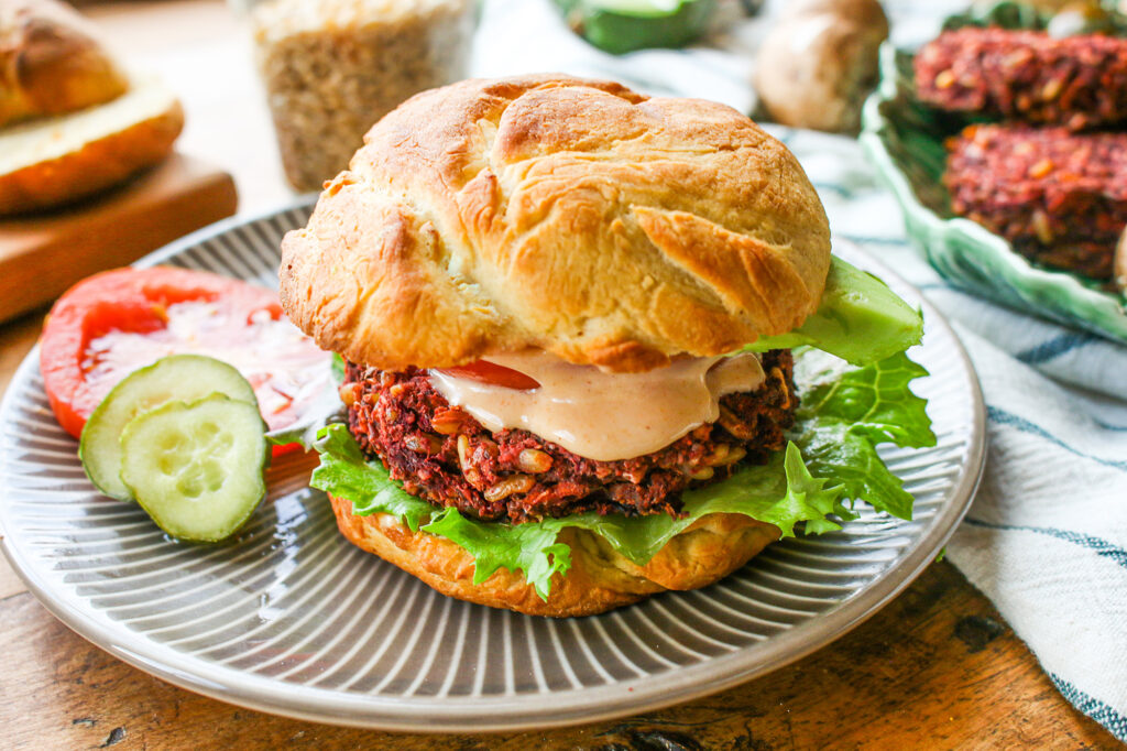 What if your favorite comfort food could also be a nutritional powerhouse? Meet the ultimate plant-based meal featuring wholesome KAMUT® brand wheat. Picture hearty, savory veggie burgers packed with the earthy flavor of mushrooms, the natural sweetness of beets, and the nutty richness of KAMUT® brand wheat berries. Pair them with quick, homemade buns made from KAMUT® brand wheat flour—soft, wholesome, and ready in no time.