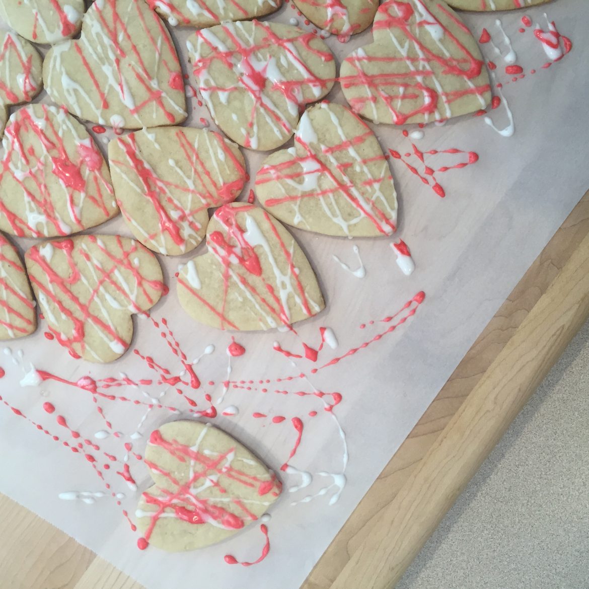 Preheat oven to 325 degrees. Line 2 rimmed baking sheets with parchment paper. Remove dough and let it stand for 10 minutes. Roll out to ¼” thick, between two floured sheets of parchment. Cut with a 2½” heart shaped cookie cutter.