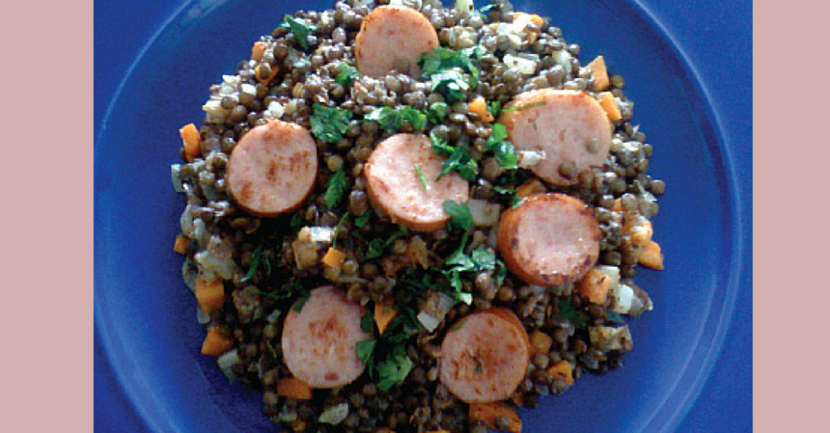 Brown the Kielbasa sausage in a clean dry skillet, about one minute each side. Work in batches so sausage does not overlap. Stir Kielbasa into lentils and serve, topping with fresh parsley.